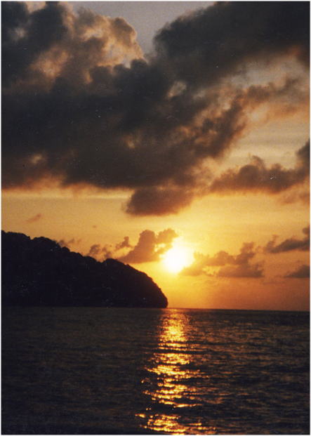 に沈みゆく太陽は、熱帯地方特有の厚い積乱雲を茜色に焦がし、海も空も島も
